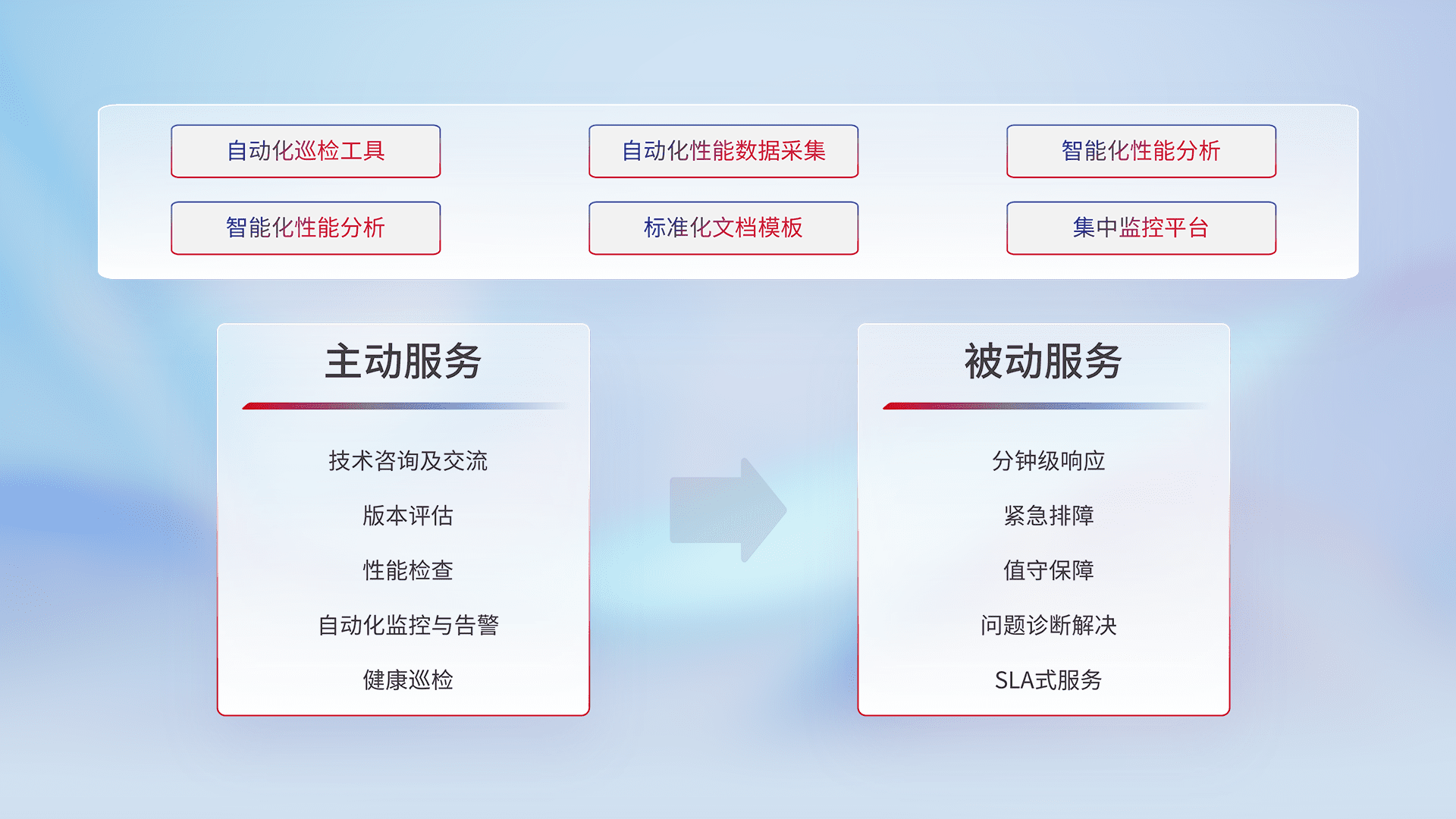 智能化工具和标准化文档,,,保障服务质量,,,,提供主动服务(包含技术咨询、、、版本评估、、、性能检查、、自动化监控与告警、、、健康巡检)和被动服务包含(分钟级响应、、紧急排障、、值守保障、、问题诊断解决、、、SLA服务)。。。
